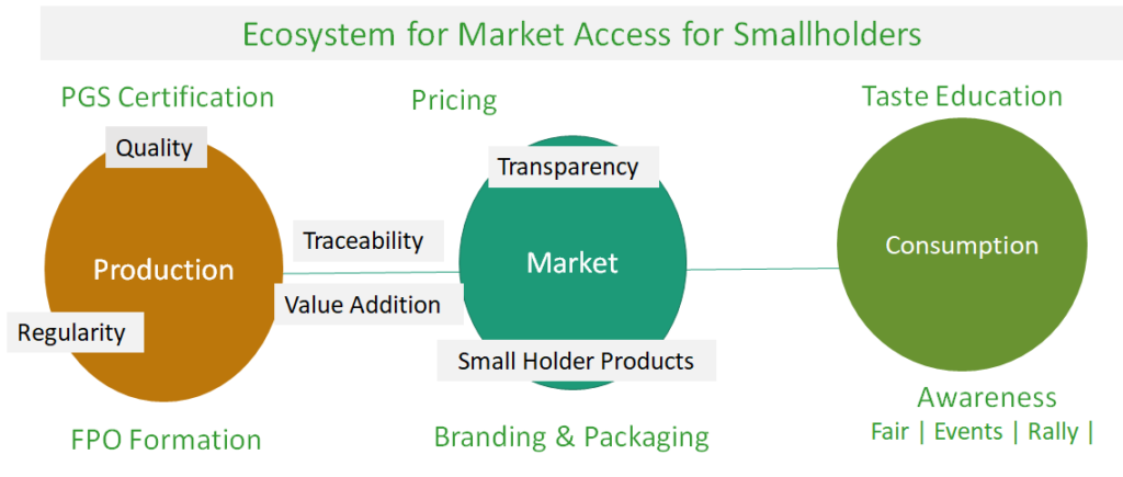 The action under this initiative contributes to the establishment of sustainable local food systems by addressing entire food value chains which nurtures both pull and push factor to promote sustainable production and consumption. There are various initiatives in promoting ecological methods of production but that does not result, most of the times, in catering the market demand – as quality, regularity and quantity are certain values that the market is looking for which are difficult for small holder farmers as they operate in low scale of surplus. One major principle that the initiative follows is to ensure diversified diet at the producer’s family first – and only surplus is taken to the market. Formation of Community Enterprises / Farmer Producer Organisation (FPO) with 500~800 farmers ensure accumulation of surplus product to attain scale on one side and working as a layer between the market and the farmers on the other side. Participatory Guarantee System (PGS) certification ensures the quality of produce at the production end.
