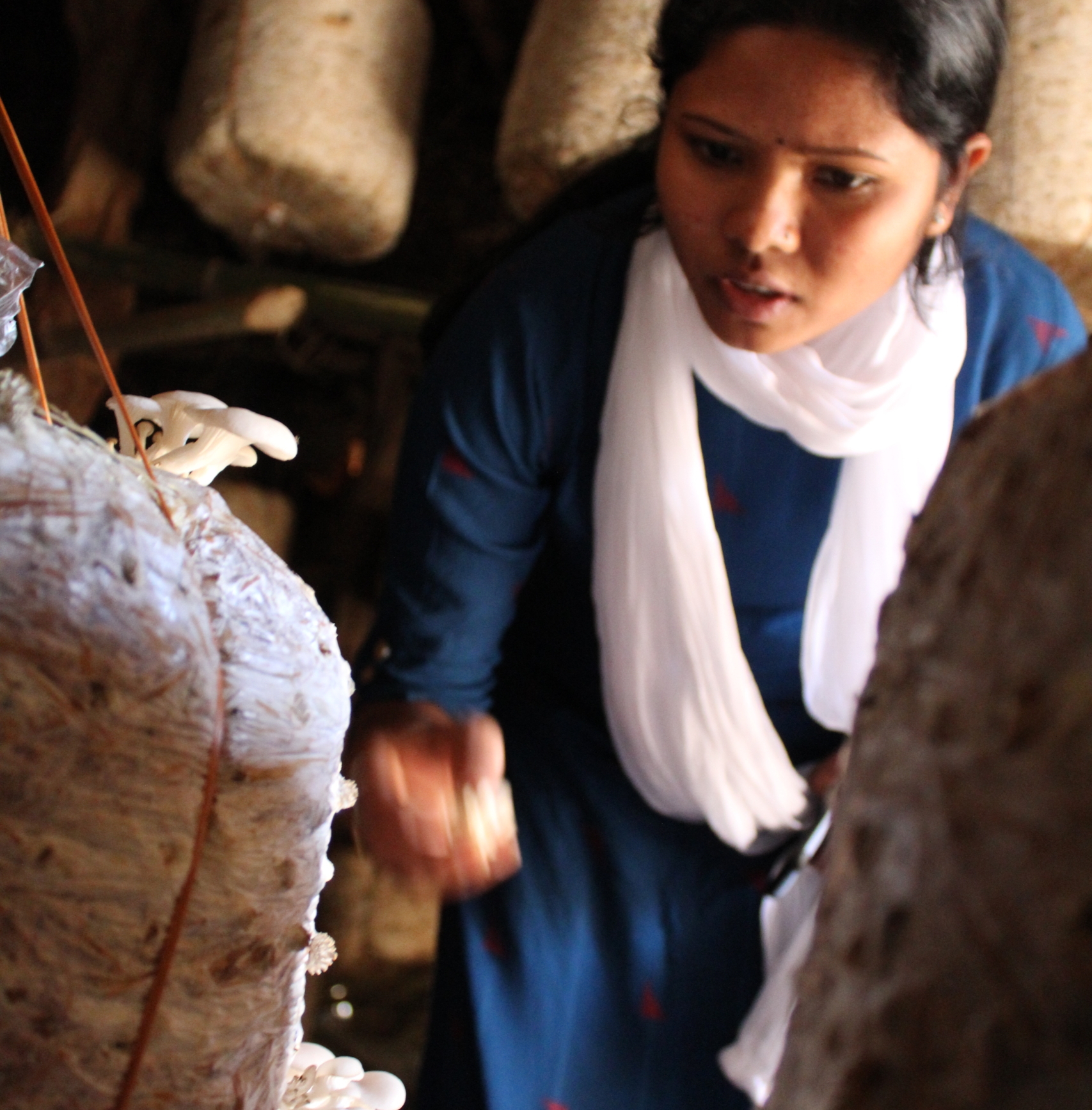 Sanjukta inspecting the quality of mushroom at a farmer’s cultivation centre in Malkangiri.